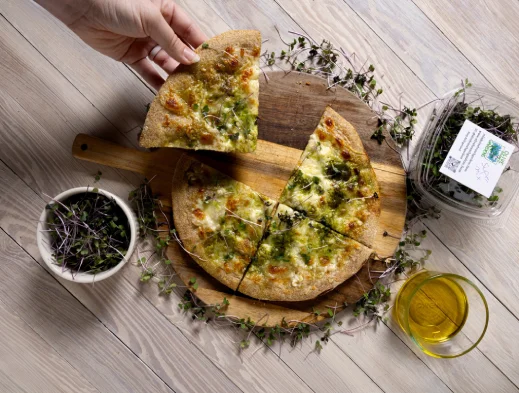 Grow and dough crust with sauteed garlic, parmesan cheese and cream and cream sauce microgreen pesto and fresh mozzarella & cheddar blend